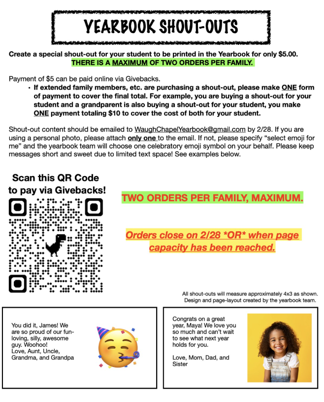 Yearbook shout-outs are on sale! Click the link below to purchase. Orders will close 2/28 or when page capacity has been reached. Link: https://tinyurl.com/shoutoutswces |