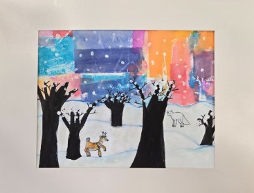 Isabella S. - Grade 2 "Winter Landscape with Animals" Mixed Media |