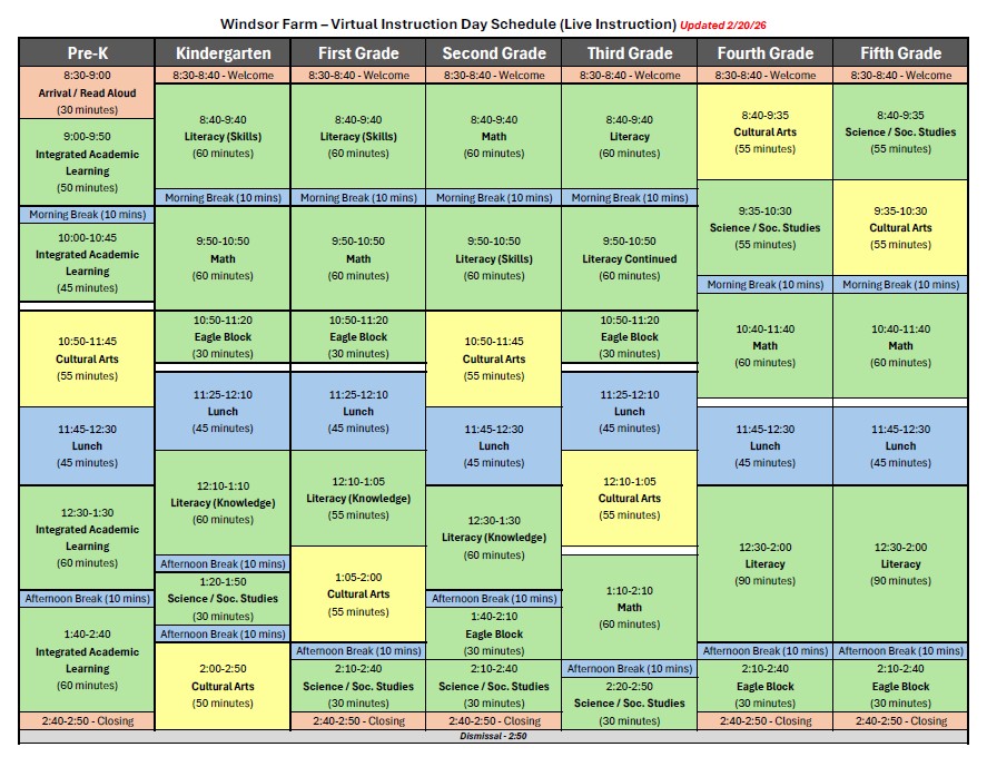 Please review the Windsor Farm Virtual Learning Schedule below for complete details. (click on schedule to open a PDF version) |